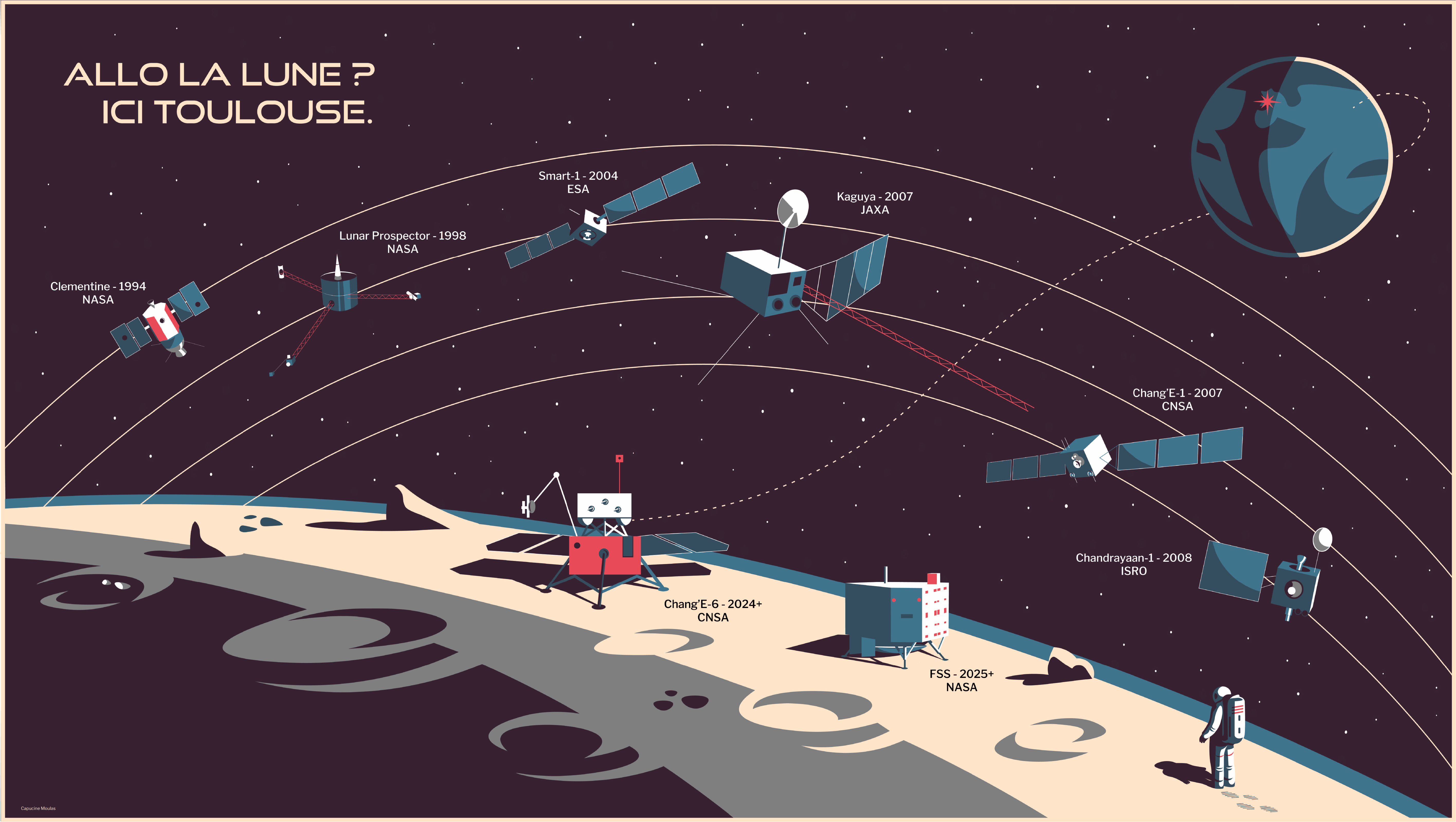 Réalisation de deux affiches grand format destinées aux locaux de l’Institut de Recherche en Astrophysique et Planétologie (IRAP) à Toulouse pour illustrer les missions spatiales réalisées vers Mars et la Lune.